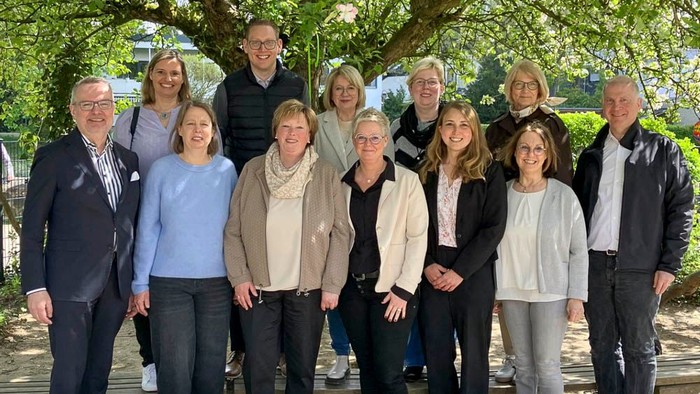 Titelfoto: Die Kita Frühlingsweg feierte ein sonniges Jubiläum mit Eltern, Mitarbeiterinnen und vielen Gästen. Mit dabei waren unter anderem auch Superintendent Dr. Olaf Reinmuth (links), Pfarrer Rainer Wilmer (rechts) von der Kirchengemeinde und die kreiskirchliche Kita-Geschäftsführerin Frauke Meyer (vordere Reihe, 4 v. li.).