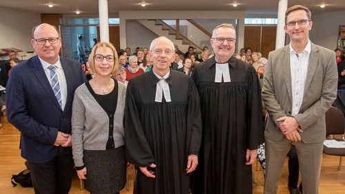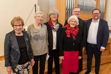 Foto oben: Superintendent Reinmuth (2.v.r.) verabschiedete und dankte Marlies Stoltenberg, Erika Homburg, Brigitte Schiefer, Gisela Sauerland und Jan-Philipp Schnier (von links) für ihre langjährige Mitwirkung an den Gottesdiensten im Lukas-Krankenhaus.