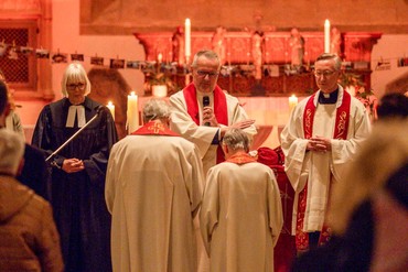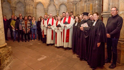 Titelfoto: Annette und Johannes Beer zusammen mit Superintendent Dr. Olaf Reinmuth zusammen mit den Bevollmächtigten der Kirchengemeinde Herford-Mitte-Land und ökumenischen Gästen