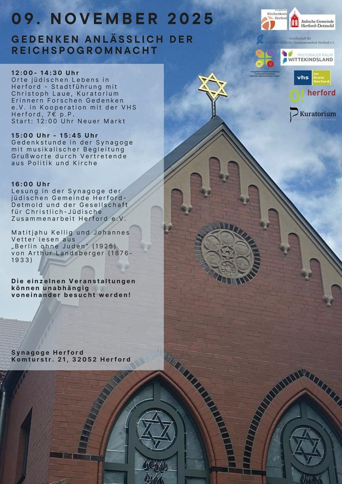 Am 9. November 2025 erinnern in Herford mehrere Veranstaltungen an die Reichspogromnacht von 1938. Der Gedenktag soll die Erinnerung an die Opfer der nationalsozialistischen Gewalt wachhalten und wird zugleich den Blick auf das lebendige jüdische Leben richten.