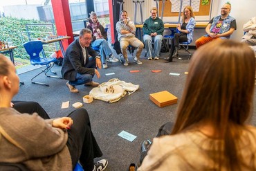 Foto oben: Pfarrer Christian Rasch stellt den Teilnehmenden das „Godly Play" als Konzept spiritueller Bildung vor.